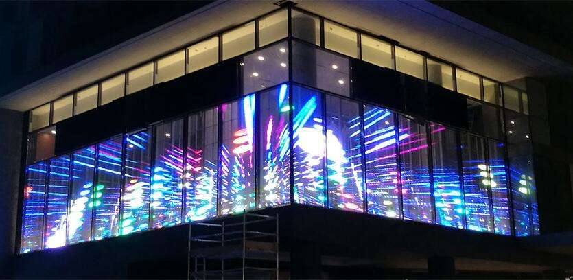 3、美觀:常規(guī)led顯示屏在搭建時(shí)需大規(guī)模的鋼架結(jié)構(gòu),費(fèi)時(shí)費(fèi)力并一定程度影響樓體的造型及美觀度。而led透明屏在安裝時(shí)僅需少量鋼架結(jié)構(gòu)即可輕松與墻體完美結(jié)合,對(duì)墻體無(wú)損害,還可提高其外觀整體美觀度。