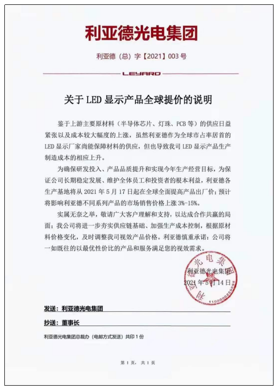 5月17日,利亞德發(fā)布LED顯示產(chǎn)品全球提價(jià)通知“鑒于上游主要原材料(半導(dǎo)體芯片、燈珠、PCB等)的供應(yīng)日益緊張以及成本較大幅度的上漲,利亞德將從即日起在全球全面提高產(chǎn)品出廠價(jià)?!币皇て鹎永?,頓時(shí)在行業(yè)內(nèi)引發(fā)巨大反響。